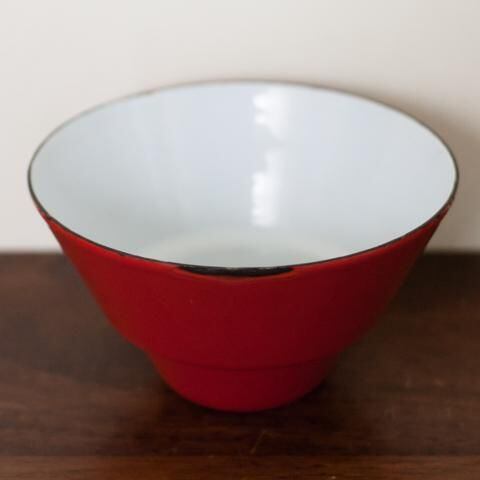 トマトレッドのボウルの端に巾約3CMの小さなカケがあり多少の使用感はありますが良い状態です