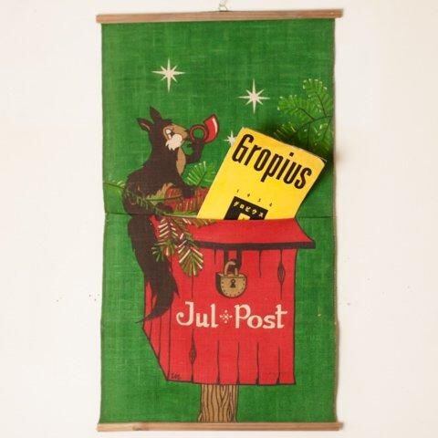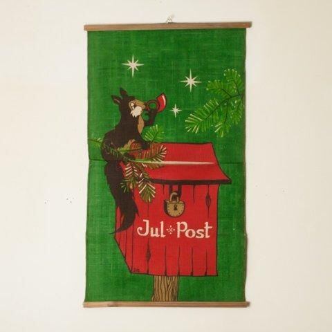 スウェーデン生まれのタペストリー! JUL POSTの上でホルンを吹くかわいいリス! ポストはポケットになってます! 上下に木のバーが付いています! (サインが入っていますが判別できませんでした) 多少の使用感はありますが良い状態です Item code:TXS-5003Size:34cm×58cm Material:JUTE Designer:UNKNOWN Age:UNKNOWN Made:SWEDEN