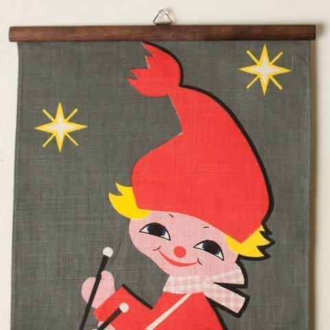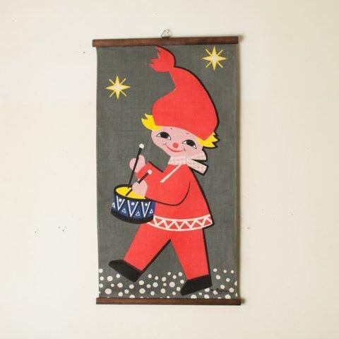 スウェーデン生まれのタペストリー! 太鼓を叩いて行進するかわいいトムテ! 上下に木のバーが付いています! 多少の使用感はありますが良い状態です Item code:TXS-5004 Size:27.5cm×51cm Material:LINEN Designer:M Buhler Age:UNKNOWN Made:SWEDEN
